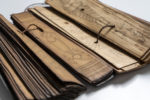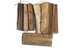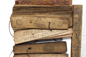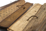 Manuscrits de Birmanie ou du Siam. Ensemble de 2 sutras sur feuilles de latanier et bambou, écriture birmane avec suite de dessins de divinités, ais de bois servant de couverture, l'un sculptée de décors géométrique, l'autre peinte (23x6 cm &...