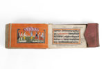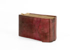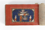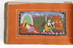 orange, rouge et bleue. Le texte ponctué de 33 illustrations à la gouache et à l'or encadrées d'une bordure noire ponctuée de rosettes blanches et d'une large marge orange, l'une d'elle à bordure verte et marge rouge. Les gouaches mettent en scène des dieux du panthéon hindou, principalement Krishna. Dim. reliure : 11,8 x 20 cm Une page détachée, une page arrachée, reliure usée, cinq vignettes probablement d'un autre manuscrit collées plus tardivement sur deux pages de garde finales, quelques notes marginales ou interlinéaires plus tardives sur certains folios, légères taches, pliures et déchirures. Le Bhâgavata Purâna compte parmi les plus importants textes sacrés hindous écrit en langue sanskrite et connus sous le nom de Purânas. Il s'agit du livre sacré des Bhâgavatas, les dévots de Vishnu. Se composant de 18000 strophes, il s'agirait d'un des plus récents des Purânas avec une rédaction vraisemblablement postérieure au Xe siècle. Il a pour sujet principal la vie du dieu Krishna, l'un des avatars de Vishnu, mais traite également de cosmologie, de généalogie, de mythologie et de nombreux autre thématiques.