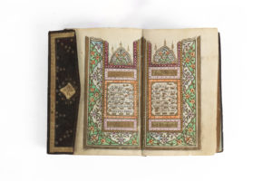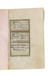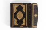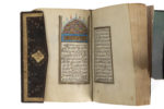 à l'or et en polychromie, le texte en réserve sur fond d'or, encadré de deux cartouches dorés surmontés d'un lambrequin, l'ensemble encadré d'une marge florale. Les sourates sont séparées par des cartouches dorés, les versets par des disques dorés et plusieurs médaillons floraux enluminés agrémentent les marges. Un deuxième frontispice enluminé à décor de lambrequin introduit la Sourate Ya-Sîn (XXXVI). En fin de manuscrit, un texte d'une autre main et vraisemblablement ajouté postérieurement donne le nom d'un copiste Khalil Ibrahîm et la date du 13 Rabi' al-Awwal 1246 H / 1er septembre 1830. Reliure à rabat en maroquin brun à décor estampé d'un médaillon et d'écoinçons garnis de rinceaux floraux et rehaussés d'or. Dim. reliure : 12,4 x 8,5 cm Un plat de reliure détaché, usure et quelques sauts de dorure sur la reliure, quelques taches, rousseurs, sauts de polychromie et de dorure, une petite réparation sur une page de garde, colophon inscrit d'une autre main postérieurement.
