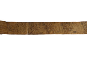 KITAB. Rouleau magique ou talisman Ge'ez. Ethiopie, XIXe. Rouleau sur parchemin de 2 pièces cousues (10,5 x 68-54 cm) ; texte sur une colonne, encre noire, rubrique encre rouge ; compositions encre noire et ocre, de deux orants entourant une croix,...