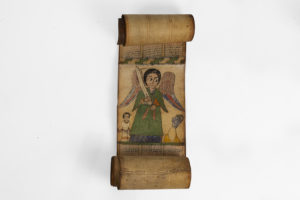 KITAB. Rouleau magique ou talisman Ge'ez. Ethiopie, début XXe. Rouleau sur parchemin de 2 pièces cousues (18 x 92-90 cm) ; texte sur trois colonnes, encre noire, rubrique encre rouge, 4 grandes vignettes en couleurs composées : 1. Roi sur son...