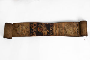 KITAB. Rouleau magique ou talisman Ge'ez. Ethiopie, fin XIX, début XXe Rouleau sur parchemin de 3 pièces cousues (9 x 62-51-60 cm) ; texte sur une colonne, encre noire, rubrique encre rouge, orné de trois vignettes encre noire et rouge...