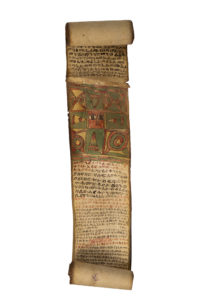 KITAB. Rouleau magique ou talisman Ge'ez. Ethiopie, début XXe Rouleau sur parchemin de 3 pièces cousues (11 x 61-68-40 cm) ; texte sur une colonne, encre noire, rubrique encre rouge, orné de trois grandes vignettes en couleurs. - usure sur la...
