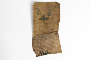 Feuillets manuscrits. XIIe siècle. 2 f° sur vélin (19 x 15 cm & 19,5 x 27 cm), texte en latin, encre brune et rouge, dessins en couleurs ; salissures, manques. Fragment de manuscrit [relevé d'une reliure du XVe siècle], extrait d'un traité sur...