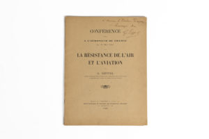 Gustave EIFFEL. 1832-1823. Ingénieur, industriel. Envoi autographe signée sur son ouvrage Conférence (…) sur la résistance de l'air et l'aviation. Paris, Extrait de l'Aérophile du 15 juin 1911 (…). Un vol. in-4, 22 pp., 2 planches dépl.,...