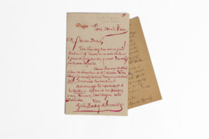 Masson : J'irai dîner chez vous avec un grand bonheur le 16. J'aurais eu un autre bonheur si j'avais été chez moi hier, quand vous avez pris la peine d'y passer. J'aurai beaucoup de plaisir à faire la connaissance de Mr Masson. Vous savez si je connais ses livres dont je suis enchanté. Jeûdi, il continûra l'enchantement. Mon hommage très respectueux à La Walkyrie. C'est une de mes déesses, à moi, Normand, dont l'origine est Scandinave (…). JOINT une lettre de Louise READ (1845-1928), confidente et secrétaire de l'écrivain, à Mme Mortier. Mardi, 15 octobre 1918. 4 pp. bi-feuillet in-12. Rendant compte de son entrevue avec Poinsat chez qui elle vient prendre plusieurs exemplaires (d'une biographie de Barbey d'Aurevilly). Cela s'est merveilleusement passé. C'est M. Poinsat qui m'ouvre la porte. Je lui dis ce que je viens chercher. Il prend les exemplaires, les seuls qu'il ait, ces dix (…). Alors, devant cette quantité requise par moi, il me demande mon nom : « Oh ! Mlle Read ! Que je suis heureux (…). » Elle se plaint ensuite de ne trouver des domestiques ; tous mes amis en sont au même point que vous. Ces femmes demandent des 100 francs par mois. La guerre aura eu, en plus de tous les massacres et des ruines sans nombre, ce triste résultat en surcroit : la dépravation des usines et l'amour effiné des gens (…).