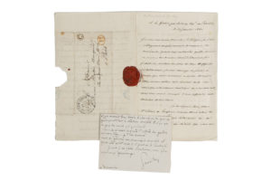 Emmanuel de GROUCHY. 1766-1847. Maréchal de France. L.A.S. au baron Mallet, banquier. A La Ferière (Calvados), 10 janvier 1840. 3 pp. bi-feuillet in-8, adresse au verso, cachet de cire rouge armorié, marques postales. Relative aux placements...