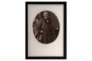 [Victor HUGO]. BERTALL. Portrait de l'écrivain. 1867. Tirage albuminé virant sépia, monté sur carton. Dimensions : ovale 14 x 17 cm. Portrait de l'écrivain devant une tenture, appuyé à un fauteuil de style renaissance ; le cliché a été pris...
