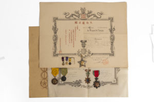 Cambodge, délivré par la Chancellerie de la Légion d'Honneur, Paris, 8 octobre 1881. (vélin 45 x 35,5 cm). - Brevet d'officier de l'Ordre impérial du Dragon de l'Annam. Hué, 15 février 1889. (53 x 40,5 cm). - Diplôme de l'Ordre du Dragon de l'Annam, délivré par la Chancellerie de la Légion d'Honneur, Paris, 7 février 1890. (vélin 49 x 39 cm). Réunion de décorations étrangères - Ordre royale du Cambodge. Etoile de chevalier. Argent, centre émaillé, ruban. BE - Médaille commémorative de l'expédition du Tonkin, Chine et Annam (1883-1885), avec ruban. BE - Ordre du Mérite de la République de l'Equateur. Etoile de chevalier. Etoile émaillée, ruban avec rosette. BE - Etoile de l'Ordre de Gorkha Dakshina Bahu du Népal. Argent, BE - Réduction de trois décorations : - Ordre du Soleil du Pérou (étoile avec ruban et rosette) ; - Ordre du Mérite du Pérou (étoile avec ruban et rosette) ; - Ordre du mérite de l'Equateur. JOINT l'avis de décès de Jules-Auguste-Léon Fontaine le 9 mars 1901. JOINT 5 feuilles papier à lettre du lieutenant de vaisseau Fontaine, commandant l'Estoc.