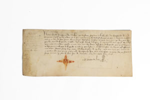 oblong (cm), trace de cachet à l'étoile de cire rouge. L'évêque déclare avoir reçu de Jehan Seaume, receveur général de ses finances la somme de 1000 livres tournois pour les mois de septembre et octobre derniers passés que le roi lui a accordé « tant que nous vacquerons et besongnerons aud. pays de Languedoc ou ailleurs pour le fait de notre dicte commission en laquelle nousassurons avoir vasqué durant yceulx deux mois