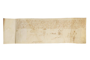 (37 x 11 cm). Antoine Bayart, « trésorier et receveur général des finances es païs de Languedoc, Lyonnois, Forestz et Beaujolois », donne décharge à Antoine Astaro, receveur particulier du Vivarais, des 5000 livres tournois qu'il a délivré à André de Laval seigneur de Lohéac et de Retz, Amiral et Maréchal de France, sur sa pension annuelle de 8000 livres tournois. Ancienne collection Saffroy
