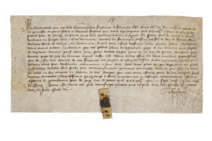 grand sceau de monseigneur le duc d'Orléans, datée du 30 mai 1396, avisant Jehan Poulain son trésorier qu'il a nommé Jehan de Haynault, page de noz lévriers aux gaiges de dix-huit deniers parisis chacun jour (…) en lieu de Pierre Rouault (…) lequel a esté desmis dudit office (…). » Charte vidimée par Jehan de Foleville, chevalier conseiller du roi et Garde de la Prévôté de Paris.