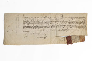 rouge sur languette. Concernant « la somme de deux mille livres tournois laquelle nous avons prestée (…) ame cousin le Roy de Navarre [Charles III le Noble] et ycelle fait baillés comptant en escuz d'or pour en son nom de mondit cousin par moi de mon feal trésorier général Jehan Poulain dès le 10e de janvier denemerement passé à maistre Etienne de la Charité clerc et secrétaire de monseigneur le Roy (…). » Le roi de Navarre s'est engagé à rembourser ladite somme aux Pâques prochaines. Ancienne collection Tausky
