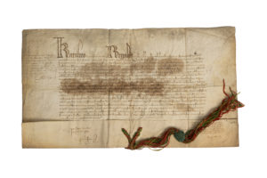 hostel de Saint-Marcel les Paris, 30 may 1398. Vélin oblong (31.5 x 17 cm). Cachet de collection à l'étoile. Important document concernant une commande de joyaux et vaisselles d'or auprès de son argentier pour en faire présent au patriarche d'Antioche et au « Roi des Romains »[Wenceslas, Empereur, roi de Bohême, duc de Luxembourg]. « Loys filz de Roy de France duc d'Orléans, comte de Valois, de Bloys et de Beaumont. A noz amez et feaulx gens de noz comptes à Paris, Salut et dilection. Savoir vous faisons que nous avons eu et receu de notre amé argentier Denys Mariete les parties de joyaulz et vaiselle d'or cy dessous déclarez, lesquelz nous avons donnez et fait délivrer ce jour aux personnes et lieu qui ensuivent : Premièrement un image d'or d'un Charlem(agne) garni de pererie sur un entablement d'argent doré, lequel nous donnasmes le 5e jour de mars dernier passé nous estant en la ville de Mouson [Mouzon dans les Ardennes, près l'abbaye bénédictine] à notre très cher et très amé cousin le Roy des Romains. Item un grant gobelet d'or couvert de la façon d'Angleterre garni de quatre vins pelles [perles] et un gros saffir ou frecelet lequel nous avons donné à notre dit cousin audit lieu de Mouson le xxe jour dudit moys de mars. Item un hanap d'or poinçonné à un frecelet d'un bouton de rose lequel ledit xxe jour de mars nous donnasmes audit lieu de Mouson à Révérent Père en Dieu le patriarche d'Antioche. Item un autre petit hanap d'or couvert poinçonné de couronnes à un frecelet de IIII petites pelles par nous donné ledit jour audit lieu de Mouson à messire Jehan de Meulent chevalier conseiller de notre dit cousin. Et vous mandons que des joyaulx et vaisselle d'or dessus diz vous deschargiez et acquittiez notre dit argentier (…). Charte en son nom « par Monseigneur le Duc vous présent », contresigné Guinguant, « en notre hostel de Saint-Marcel lez Paris ». Ancienne collection Charavay