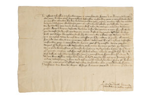 décembre. 1 p. in-4 oblong, adresse au verso. La lettre du président Rabateau au duc de Bretagne dont il est fait mention dans le précédent courrier, sur l'entrevue proposée avec le roi de France en janvier prochain. Charles VII est d'accord pour rencontrer le duc de Bretagne mais demande la levée de 2000 livres tournois pour payer les frais. Le rapprochement des deux souverains devait aboutir à une alliance contre les Anglais. « (…) Je me recommande humblement à votre Grâce (…) Moy estant à la Caillère, j'ay receu les lettres qu'il vous a pleu m'escripre touchant le fait des Marches de Poictou et de Bretaigne par lesquelles appert que c'estait sur ce vostre plaisir que l'assemblée des gens du Roy et des vostres pour traicter sur la matière, fust au lieu de Mortaigne au xxe jour de janvier prochain. Après la réception desquelles vos lettres, je suys venu à Poictiers et avons esté ensemble les gens du Conseil du Roy en son païs de Poictou et moy, auxquels j'ay monstré vos dictes lettres, et leur semble que ledit jour et lieu par vous advisez sont bien convenables (…). Le Roy a ordonné pour entendre à la matière seront audict jour et lieu, et en ce, n'aura point de faulte de leur part. Et pour ce (…) qu'il est de nécessité d'avoir provision d'argent pour les fraiz et mises de la conduyte de la matière, les envoye par delà par le porteur de ces présentes les commissions pour lever sur les habitans desdictes marches la somme de IIm [2000] livres pour convertir et employer ausdicts fraiz, ainsi que le Roy l'a ordonné et commandé par ses dictes lettres. Et vous plaise, très hault, très puissant et très excellent prince et mon très redoubté seigneur, faire faire et donner de vostre part bonne obéissance de lever ladicte somme sur lesdictes marches afin qu'il n'y ait rompture en la conduyte de la besongne (…). » Ancienne collection de Marbourg