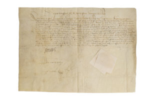 mai 1577. Vélin oblong, cachet aux armes sous papier. Mandement « de par Monsieur, fils de France, frère unique du Roy » adressé à « nostre amé et feal le comte de Saint-Aignan, chevalier de l'Ordre du Roy, capitaine de cent hommes d'armes des ordonnances de Sa Majesté, nostre conseiller chambellan ordinaire et surintendant de nostre Maison (…) ; Considérant les bons et agréables services que nostre amé et féal Imbert de Bourrelon, Sgr de Meuret, a faict de ses guerres, icelluy avons retenu et retenons en estat de l'un de nos chambellans ordinaires au lieu et place du feu Sgr de Chasteaubaudeau, dernier possesseur. » Ancienne collection Morssen