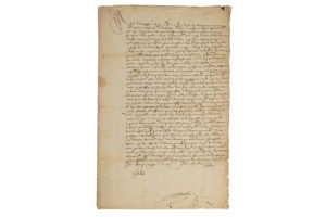 5 septembre 1575. 1 p. in-folio, adresse au verso avec restauration aux plis ; filigrane du papetier Nicolas Leubé. Intéressante lettre d'Elisabeth d'Autriche, dans laquelle la reine règle le sort de son douaire, après la mort de Charles IX l'année précédente. « (…) Ayant entendu combien le feu Roy monseigneur aymait et se confiait au seigneur de l'Aubespine votre père et combien il aimait déffunct votre fère et que recongnaissant celle pour la mesme confiance qu'il avait en vous comme successeur de leur probité et vertu, il vous avait donné à moy (…) C'est pourquoy je vous ay eslu et choisy pour demander à quil appartiendra au pays et duché de Berry la haulte et basse Marche et seigneury de Murat et Ganap déppendant du duché de Bourbonnays qui m'ont esté délaissés pour partye de l'assignat de mon douaire ; aussy comme vous avez pu entendre la possession et jouyssance desdits duché, pays et seigneuries et ladite possession prendre et appréhender en mon nom, vous ayant à ceste fin faict expédier mes lettres patentes de pouvoir et procuration, en vous pryant en ensuivant d'y satisfaire au plus tost, conformément au contrat que j'en ay passé avecques le Roy Monsieur mon frère, le double duquel je vous envoye deuement collationné avecques les lettre du Roy (…) et les myennes qui les accompagnent, et ceulx à qui j'ay estimer qu'il se devayt escripre tant pour publyer et rédiger led. Contract que pour vous mectre en possession en mon nom dont vous ferez retirer les actes nécessaires en bonne et deue forme, pour me servir selon le besoing (…). » Elle le prévient qu'elle a retenu l'évêque de Paris comme son chancelier et demande de s'entendre avec lui sur les démarches entreprises. « Au surplus comme j'ay résolu que mon conseil duquel je vous ay retenu et des premiers, sera séant et estably en ceste ville de Paris ». Avec l'évêque de Paris, il s'entendra sur toute ses affaires, sur ses comptes, et le maintien des divers juges et officiers avec lesquels elle assure qu'elle sera « bonne maitresse, et n'oublieray de les recongnaistre comme ils seront bien de sorte qu'ilz auront occasion de demeurer contant de moy (…). » Elle compte sur les bons offices de son correspondant. Ancienne collection Fillon ? et Charavay.