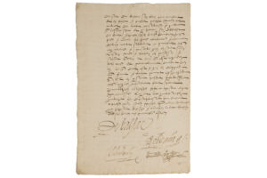 François de BALZAC. 1541-1616. Seigneur d'Entragues, capitaine des cents hommes d'armes du roi, bailli gouverneur d'Orléans qu'il livra aux ligueurs catholiques. P.S. Château de Marcoussis, 17 avril 1594. 2 pp. in-8. Procuration générale et...
