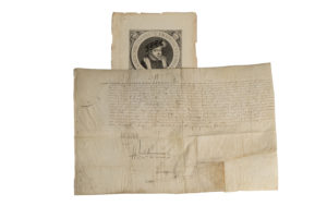 cm). Joint un portrait gravé. Le roi donne l'ordre de dispenser, conformément à la décision prise par son père Henri II, les moines de Saint-Jean des Vignes de Soissons, des contributions qui leur avaient été imposées pour la réparation des fortifications de la ville de Soissons. Pièce signée au tout début du règne du jeune roi, quelques mois encore avant son sacre (en septembre), contresignées « par le Roy, Monsieur le Card(inal) de Lorraine présent, L'Aubespine ». Ancienne collection Charavay
