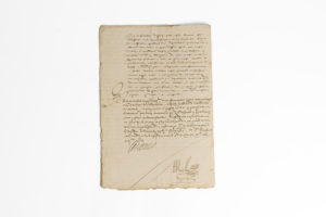bifeuillet in-folio, intitulé au verso. Décret du Conseil de Lorraine, par lequel le duc approuve et signe, en la renvoyant pour exécution au prévôt de Gondreville, une requête de son « très humble orateur » François de Rozières, archidiacre de Toul, lequel se plaint du non-paiement de certaines redevances qui lui sont dues, à cause de son archidiaconé, par les manants et habitants de Longneulx et de Foug. [Ce François de Rozières est l'auteur des Stemmata Lotharingiae et Barri Ducum, imprimés à Paris en 1580. Ancienne collection Saffroy