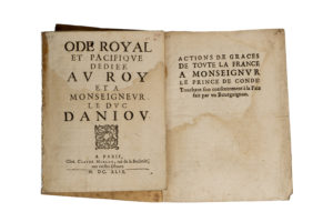 [MAZARINADES]. Réunion de deux textes : - Actions de Grâces de toute la France à Monseigneur le Prince de Condé touchant son consentement à la Paix fait par un Bourguignon. S.l.n.d. (1649). 7 pp. in-4, broché sous couverture. - Ode royal et...