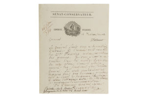 le général Soult souhaite attacher à son armée comme commissaire des guerres. « (…) Je vous supplie de vouloir bien lui accorder le brevet de cette place dont il a déjà exercé les fonctions (…). Les états de ses services déposés dans vos bureaux prouvent qu'il a servi à la guerre de façon à être distingué entre les plus braves (…). En apostille, l'adresse du recommandé « chez le sénateur Bougainville, rue du Helder n°6 Boulevard d'Antin. » Ancienne collection Charavay