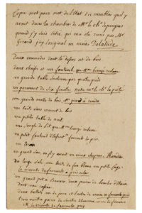 mot de l'état des meubles qu'il y avait dans la chambre de Mr de Pougens quand j'y suis entré, qui m'a été remis par Mr Girard. J'ay l'original en main (…). » Suit la liste détaillée de meubles et objets divers, avec quelques curieuses remarques sur leurs propriétaires, le chevalier de Pougens et le vicomte de Foucault. « Deux commode dont le dessus est de bois. / Deux chaises et un fauteuil que Mme Beaugé réclame / Un grande table soutenue par quatre pieds / Un paravant de six feuilles. Nota. Mr le Chv l'a prété (…) / Un grand sac où il y avait un vieux chapeau. Rendu / Du linge sale, une boête de fer blanc, une petite cage ; le vicomte de Foucault a pris cela (…) / Une tête à perruque rendu au domestique de M. le chv de Gestas (…). » A propos de tout un ensemble d'objets : « Le vicomte de Foucault a pris toute cette baterie de cuisine et les ustencilles. Ancienne collection Saffroy