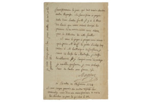 1784. 2 pp. petit in-8. Lettre adressée probablement à sa bienfaitrice, Madame Legros, et écrite un mois avant sa libération définitive le 23 mars. Latude demande à sa correspondante de faire porter une lettre à M. de Conflans et de lui envoyer par le commissionnaire des provisions : « (…) Voici le Carême. Ne pourriés vous pas me faire le plaisir de m'envoyer par le commissionnaire quand il viendra chercher ma réponse, deux cens nois, et si les pommes de renettes ne coutent point au dessus, de dix à douze sols le quarterons. Vous m'en enverrés un demi cent, mais je n'en veux pas qui coutent au dessus de ou 12 sols le quarterons. Ne manqués pas de me donner des nouvelles du petit frère. Je tremble plus pour luy que pour moy. Je perds l'espérance de pouvoir faire le Carnaval avec vous et le papa. Nota. N'oubliés pas de dire au commissionnaire le jour qui doit venir chercher votre réponse. Sa commission est payée. Nota. Il y a le reçu du louis que vous m'avez envoyé (…) ainsi vous n'avez qu'à le détacher de cette feuille. Si vous le juger à propos, vous n'avés qu'à prier M. de C** de porter l'incluse luy même à M. le Marquis de Conflans, je vous en laisse la maitresse. » Il ajoute : « Je souffre terriblement. Et je languis encore d'avantage (…). » Suivent plusieurs nota sur les provisions qu'il demande et ses goûts. Ancienne collection Charavay