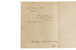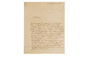 janvier 1828. 1 pp. ½ bi-feuillet in-4, adresse au verso (Rue neuve de Berry aux Champs Elysées) avec marque postale. Lettre dans laquelle elle recommande avec bienveillance une de ses anciennes domestiques ; (…) Je lui ai donné un certificat d'exactitude et de probité que je confirme très volontiers. Elle connait fort bien son état, et pendant tout le temps qu'elle a été à mon service, je n'ai point eu à me plaindre d'elle. Les Dames qu'elle a servies avant moi m'ont également rendu un bon témoignage sur son compte (…). Elle n'a pas aperçu le moindre défaut ou penchant dont sa correspondante croit pouvoir craindre. Elle est restée assez longtemps avec moi pour que j'eusse pu facilement le découvrir (…). Rare.