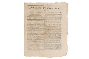 à Barbaroux, dans laquelle elle était "décidée à l'exécution de son projet" et du dernier article que Marat rédigeait sur Saint-Fargeau, avant d'être tué. L'imprimé est suivi des deux rarissimes pages de supplément contenant "l'interrogatoire de Marie-Anne-Charlotte Corday d'Armant". Parmi les autres nouvelle du journal, l'annonce de "Challier guillotiné à Lyon, dit-on" (...). Ancienne collection Morssen