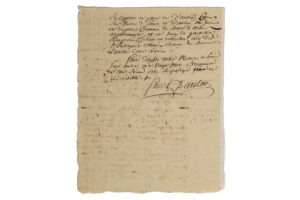 Contrat conclu entre Simon marchand fabriquant de bois et Georges-Jacques Danton représentant du Peuple, demeurant ordinairement à Paris (…) Et moi dit Danton, donne en contre échange aud. Simon, la quantité de cinq denrées (vingt un carreaux ou environ) de bois taillis, situées même finage d'Arcis, lieudit près et tenant à l'enclos des héritiers père Jean Camus (…). Pièce sans doute signée lors de son dernier séjour à Arcis, rentrant deux jours plus tard à Paris. Ancienne Collection Charavay