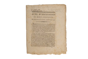original de l'acte d'accusation dressé par Fouquier-Tinville contre Marie-Antoinette, tiré à l'Imprimerie du Tribunal Révolutionnaire, « Rue Saint-Honoré n°355, vis-à-vis l'Assomption ». Il n'est pas expurgé de la plus infâme des accusations portées contre l'infortunée reine, entre autres crimes, celui d'inceste avec son propre fils, « l'Enfant du Temple » : (…) Qu'enfin, la veuve Capet, immorale sous tous les rapports, et nouvelle Agrippine, est si perverse et si familière avec tous les crimes, qu'oubliant sa qualité de mère et la démarcation prescrite par les loix de la nature, elle n'a pas craint de se livrer, avec Louis-Charles Capet, son fils, et de l'aveu de ce dernier, à des indécences dont l'idée et le nom seul font frémir d'horreur. (…). [page 7, § 3]. Ce passage sera immédiatement supprimé et ne figure plus sur les autres copies, ni sur l'affiche qui reproduit le restant de ce long texte. On sait que cette accusation fut reprise par Hebert et que Marie-Antoinette la repoussa avec une noble indignation qui émut même ses ennemis. Le 3 octobre, Fouquier-Tinville avait stipulé par décret que « le Tribunal Révolutionnaire s'occuperait sans délai et sans interruption du jugement » comme cela est mentionné dans l'acte d'accusation. Le 14 octobre, le procès débutait… Exemplaire portant une date manuscrite : « 13 octobre 1793 - 22 vendémiaire an 2 », apostille autographe de Villenave, avocat (bibliophile et collectionneur d'autographes) qui défendit plusieurs révolutionnaires nantais mais aussi plusieurs chefs vendéens dont Charette.