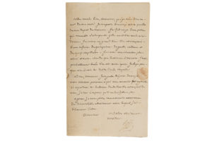 lettre sur l'installation de la Cour de Louis XVIII en exil à Mittau. Il remercie son correspondant de lui donner des nouvelles de sa femme restée à Varsovie, la neige et le gel empêchant les communications, et poursuit : « Nous attendons aujourd'hui samedi votre digne général que nous aimons bien. J'ai fait chauffer son logement qui est celui qu'habitait Mr le Cte de Cossé, M. de La Chapelle sera bien. M. le duc de Grammont reprend l'appartement que vous lui avés connu. M. l'abbé Edgewort rentre dans sa triste chambre. Nous avons perdu celle de Mgr le Cardinal [de La Fare] et de M. de St-Priest, habité depuis le départ de ce dernier par M. de Vellecourt (…). M. le vicomte Dagoust qui est arrivé depuis quelques jours occupe momentanément deux chambres où logeaient M. le comte et Madame la comtesse de Damas. M. Dagoust sera forcé d'aller en ville lorsque M. et Mde de Damas viendront à Mittau. Je reçois aujourd'hui une partie des meubles que M. le général-gouverneur résidant à Riga envoya pour le Roi. Ils seront d'un très grand secours (…). Je me porte beaucoup mieux que lors de mon départ de Varsovie. J'ai fait usage d'une potion qui ressamble à celle que M. Gilles avait bien voulu m'ordonner (…). Elle est composée d'une infusion de quinquina, de goutte anodine et de syrop capillaire (…). » Ancienne collection Tausky.