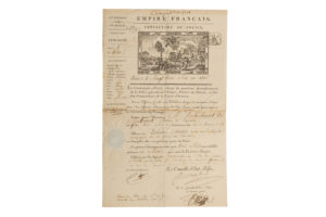 armorié à l'Aigle impériale sous papier, timbre ; document déchiré aux plis, restauré. Passeport pour l'étranger valable trois mois, délivré par la Préfecture de Police de l'Empire à Mlle Victorine de Rochechouart de Mortemart, se rendant en Westphalie par Aix-la-Chapelle, accompagnée de sa femme de chambre. Pièce signée par DUBOIS, préfet de Police, contresignée par son secrétaire général, le chevalier PIIS, portant le visa de TALLEYRAND, ministre des Relations extérieures de l'Empire, contresigné par D'HERMAND chef de bureau du ministère.