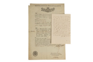 bifeuillet in-12. Emouvante lettre dans laquelle elle rappelle son attachement pour la ville de Lille et ses habitant. « (…) Vous allés donc voïager dans la famille de votre époux, à coup sûr vous vous y ferés chérir, car avec votre caractère, vous êtes destinée à être aimée et estimée de toutes les personnes qui vous connaitrons et avec qui vous vivrés habituellement. Bien des gens perdent à être connue mais vous, ma chère Montoban, vous ne pouvés qu'i gagner (…). Monsieur dîne avec nous ajourd'hui, s'il me laisse le tems de parler, à comme je m'entretiendrai de la bonne ville de Lille, et de ses habitants. (…). Il ya quelques cemaines qu'une personne venant de Lille me dit que l'on avait répandu le bruit que vous étiés grosse ; si cela était, je vous en fais mon compliment ; car je crois que vous seriés bien comptante de porter le dou titre de mère ; et personnes mieux que vous n'est capable dans remplir les devoirs (…). JOINT un certificat de décès d'un officier logé aux Invalides, signé de François-Charles marquis de SOMBREUIL (1723-1794), Gouverneur des Invalides, du 24 juin 1792 (1 p. in-folio en partie imprimée, avec en-tête de l'Hôtel royal des Invalides ; déchirure). Suspecté d'avoir défendu les Tuileries en août 1792, Sombreuil fut enfermé à la prison de l'Abbaye puis à Sainte-Pélagie avant d'être guillotiné en juin 1794. Ancienne collection Loliée.