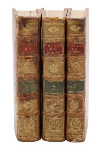 La Haye, Étienne Foulque & François L'Honoré, 1699. 3 volumes in-12 (sur 4), veau moucheté, guirlande dorée, dos orné, chiffre PB doré en queue, tranches jonquille (Reliure de la fin du XVIIIe siècle).Seconde édition très augmentée de ces récits de voyages composés par Jean Dumont, baron de Carlscroon (1667-1727), publiés pour la première fois en 1694 sous le titre Nouveau voyage du Levant.