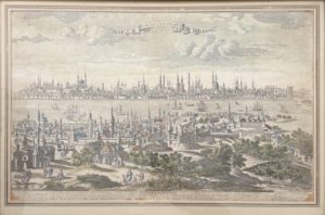 s.d. [XVIIIe siècle]. Gravure sur cuivre coloriée (52 x 34 cm à vue), sous verre, cadre en bois doré. Épreuve coloriée de ce beau panorama d'Istanbul, légendé dans la partie inférieure.
