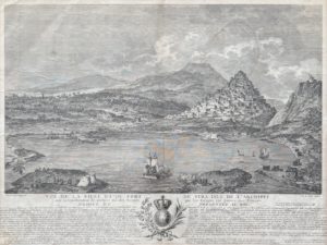 On joint : MOREAU l'aîné. Vue de la ville et du port de Syra, isle de l'Archipel, avec la représentation de quelques uns des secours que les Syriotes ont donnés aux François, dédiée et présentée au roi par l'Abbé de La Roque [della Rocca], vicaire-général de la même ville. Belle vue de l'île de Syra gravée sur cuivre par E. de Neully d'après Moreau l'aîné (42,5 x 32,5 cm à vue), sous verre, cadre en bois doré. Texte descriptif au-dessous du sujet par l'abbé della Rocca. Petite tache d'humidité dans le ciel.