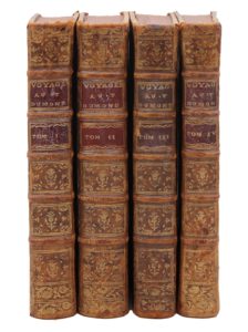 Paris, Saillant & Nyon, Panckoucke, 1774. 4 volumes in-4, veau marbré, triple filet doré, dos orné, tranches rouges (Reliure de l'époque).Première édition française, traduite par Jean-Baptiste Suard et illustrée de 30 cartes et 22 vues hors texte, dépliantes pour la plupart, gravées par Benard, Duret, Godefroy, Delaunay et d'autres.