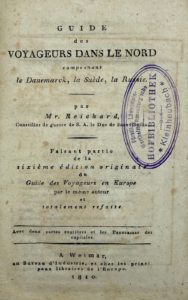 Exemplaire réunissant cinq volumes issus des sixième et septième éditions du guide de Reichard (la première édition française, en deux volumes, date de 1793), à savoir : Guide des voyageurs en France. 1810. Quatre cartes et plans, dont une carte gastronomique de la France. – Guide des voyageurs dans le Nord, comprenant le Danemarck, la Suède, la Russie. 1810. Deux cartes routières et trois plans de Copenhague, Stockholm et Saint-Pétersbourg. – Manuel instructif du voyageur. 1811. – Guide des voyageurs en Allemagne, en Hongrie et à Constantinople. 1813. Avec une grande carte d'Allemagne repliée à part et des plans de villes. – Guide des voyageurs en Italie et en Suisse. 1813. Deux cartes itinéraires et des plans de villes.
