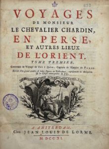 Fils d'un orfèvre calviniste, Jean Chardin (1643-1713) se rendit en Orient en 1665 pour faire commerce de bijoux. Il traversa la Perse, s'embarqua pour Surate et, après un court séjour aux Indes, revint à Ispahan, où il demeura six ans, en qualité de marchand du shah Abbas II, et apprit la langue et la culture perses. Entré à la Compagnie anglaise des Indes, il fut plénipotentiaire auprès des États de Hollande de 1683 à 1712. La relation de ses voyages en Perse constitue toujours une source indispensable pour la connaissance de la culture et de la civilisation persanes à la fin du XVIIe siècle.