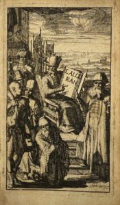 La Haye, Adrian Moetjens, 1683. Petit in-12, basane fauve, filet à froid en encadrement, grandes armoiries à froid, tranches mouchetées (Reliure de l'époque).Édition à la sphère ornée d'un joli titre-frontispice dessiné et gravé par J. Padebrugge. À sa parution, en 1647, l'édition d'André Du Ryer était la première traduction intégrale du Coran dans une langue vernaculaire européenne.
