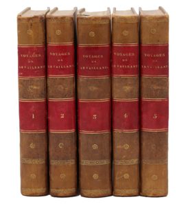 Ibid., 1803. 3 vol. Ensemble 5 volumes in-8, demi-veau fauve, dos lisse orné, pièces de titre et de tomaison rouges, tranches jaunes mouchetées (Reliure de l'époque).Nouvelle édition revue et augmentée des relations des deux voyages que Levaillant (1753-1824) fit en Afrique entre 1780 et 1785. La première est illustrée de 20 planches hors texte, dont 8 sont inédites ; la seconde, d'une grande carte d’Afrique du Sud repliée et de 22 planches montrant des types et costumes indigènes, des plantes, animaux et paysages africains.