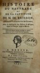 On joint : BRISSON (Pierre-Raymond de). Histoire du naufrage et de la captivité de M. de Brisson. Avec la description des déserts d'Afrique, depuis le Sénégal jusqu'à Maroc. Genève, Barde, Manget & Cie ; Liège, Desoer, 1790. In-12, basane marbrée (Reliure de l’époque). Premier récit de naufrage connu d'un Européen sur les côtes mauritaniennes, réduit en esclavage par les Maures du Cap Blanc en 1785. Cachet du Gouvernement général de l’Algérie. Reliure abîmée avec manques et épidermures, pièce de titre manquante, forte mouillure en tête du volume.
