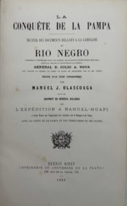 Buenos Aires, Imprimerie du "Courrier de la Plata", 1881. Petit in-4, demi-basane aubergine (Reliure de l'époque).« Relation exacte de la campagne qui a porté au Rio Negro la ligne de frontière militaire, établi le domaine de la civilisation sur les terres australes de la République et détruit pour toujours la domination des Indiens. » L'ouvrage comprend une grande carte repliée en couleurs (plis renforcés).
