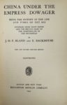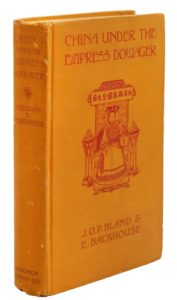 BLAND (John O. P.) et Edmund BLACKHOUSE. China under the empress dowager, being the history of the life and times of Tzû Hsi. Boston & New York, Houghton Mifflin, 1914. In-8, bradel toile imprimée (Reliure de l'éditeur). Nouvelle édition, illustrée de 20 reproductions hors texte. Notes manuscrites aux deux derniers feuillets et vue photographique en tirage d'époque contrecollée au second contreplat. Coiffes frottées.