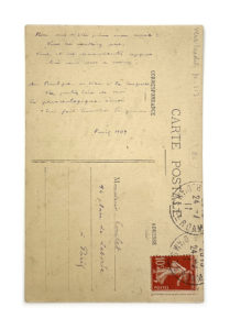 Poème manuscrit. Carte postale datée du 24 juillet 1911. 8 vers qui forment La nouvelle Contrerimes 2 publiée dans Vers inédits. 9 lignes à l'encre violette.