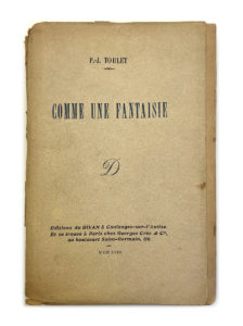 Comme une fantaisie. Editions le Divan Coulonges sur l'Autize 1918. E.O sur papier courant. Précieux exemplaire de Toulet avec des corrections manuscrites de sa main sur une dizaine de pages. Broché in-12, dos abîmé, couverture désolidarisée,...