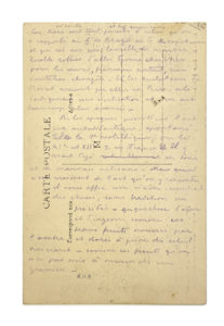 Carte postale de l'Eglise de Dorat. Texte manuscrit de Toulet au crayon violet. Commentaires sur la xénolatrie. Texte à rapprocher de la carte postale sur Saintes (crypte de Saint Eutrope) qui traite en partie du même sujet.