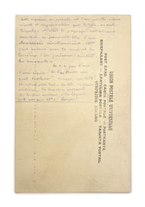 Carte postale du Musée de Bordeaux. Texte manuscrit de Toulet au crayon violet, supputations et hypothèses sur le véritable auteur de ce tableau exposé au Musée de Bordeaux et attribué au Titien.